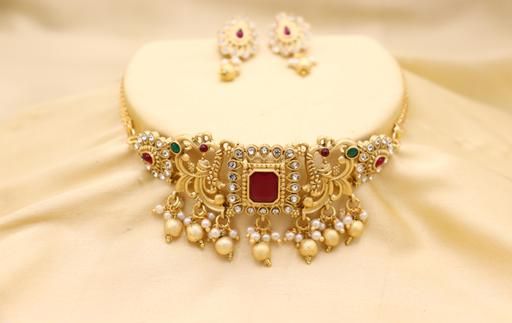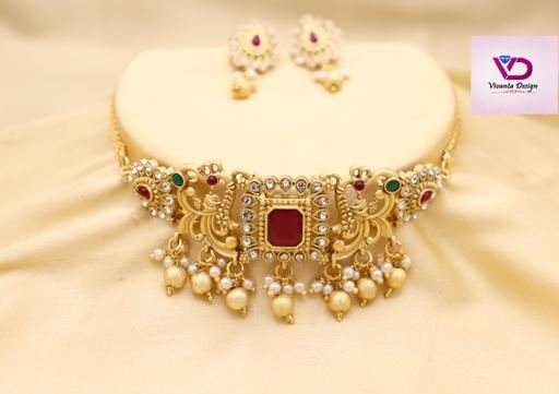 Vivanta design was manufacturer this jewelleryset Bast quality ever and Gold-plated Matte glass drop Temple Style Laxmi Choker Jewlery Set ["earring" "jewellery" "bangle" "necklace" "ring" "mangalsutra" "bracelet" "jewellery set" "jhumka" "anklet" "nosepin" "necklace set"