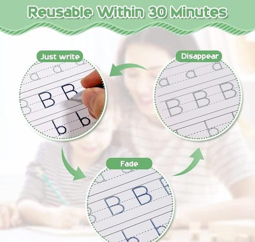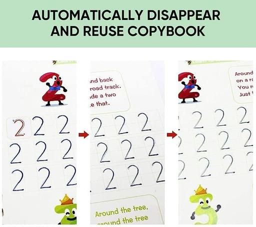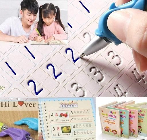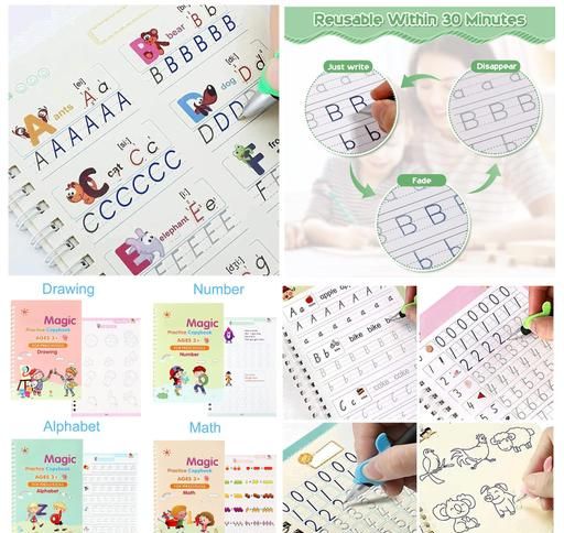 ink:- The pen with special ink will gradually fade within 30 minutes after writing, and the books are reusable. Groove:- The books are designed with special grooves which can lead your handwriting correct and beautiful! Paper:- The paper are thick and durable. Children may take it with them anywhere and paint as they like. Grips:- This set contains a pen and a grip with random color. It not only helps correct writing grip posture but also makes the writing more funny. (4 BOOK - 1- MATHS 2- DRAWING 3- ALPHABET 4- NUMBER , 1* PEN, 10 REFILL , 1* PEN GRIP)