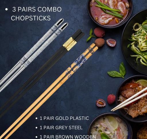 HICHAKI 3-Pairs Reusable Chopsticks Set – Stainless Steel, Wooden & Fiber with Gold Accent – Lightweight, Square Grip Chop Sticks for Sushi, Noodles & Hotpot (Korean & Chinese Style)