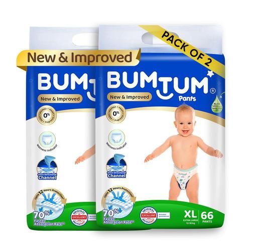 Product Name: Bumtum Baby Diaper Pants, XL Size, 132 Count, Double Layer Leakage Protection Infused With Aloe Vera, Cottony Soft High Absorb Technology (Pack of 2)