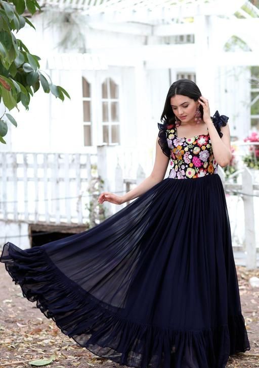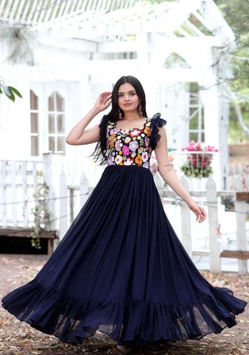 Tilton Women's Blue Faux Georgette With Sequins Multithreaded Embroidered Gown