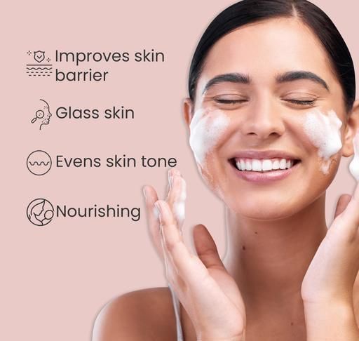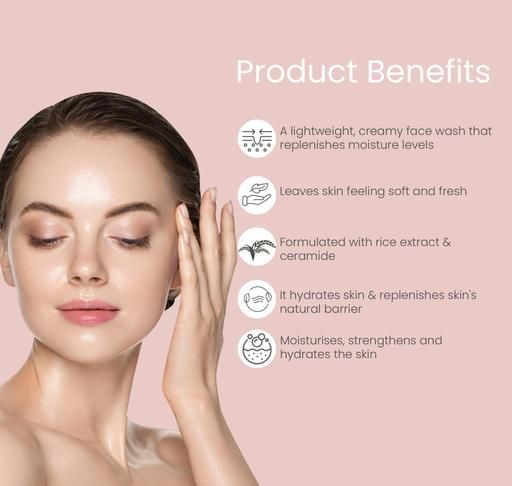 This is a barrier building and soothing ceramide and rice water face wash that fortifies your barrier from within by replenishing the lost ceramides in the skin. With continued usage, the barrier becomes stronger and more resilient, giving you smooth, supple skin.