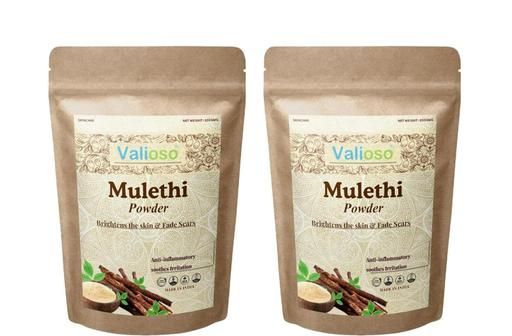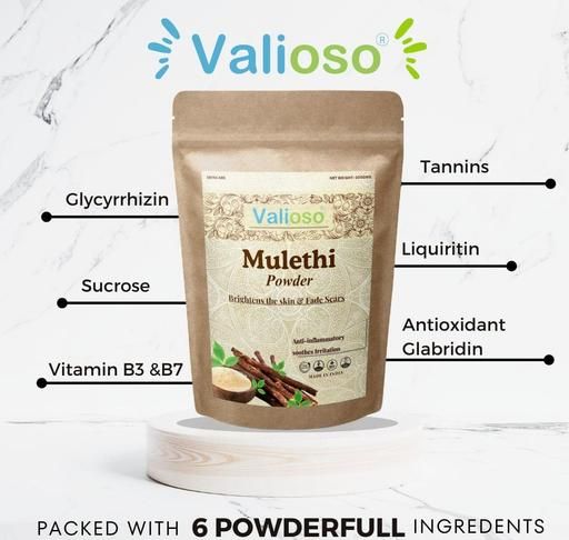 Valioso Mulethi Powder is 100% pure and organic: Contains only mulethi powder obtained by crushing the roots of mulethi plants organically grown in select Indian farms. Naturally processed, no added chemicals: A microfine, triple-sifted root powder that has no added preservatives or fragrances, also has no traces of pesticides or fertilisers. Mulethi Powder makes the skin clear and protects against harmful sun rays and environmental pollution.