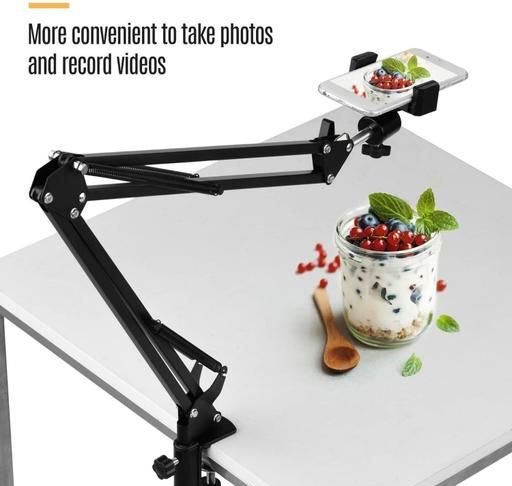 Name: Overhead Video Tabletop Stand Phone Holder, Metal Long Lazy Arm and Bracket for All Mobiles Phone, for Streaming ,Overhead Video,Desktop,Bedroom, Office, Black (Pack of 1)