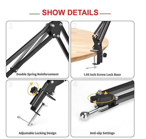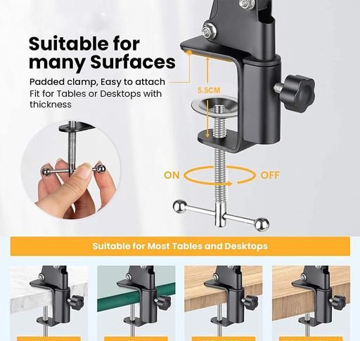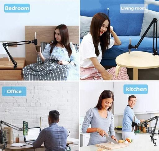 This mobile stand is made of Steel, which has a high level of quality, durability, and strength. By adjusting the lower base clamp to any edges, you can easily install it on any racks or edges of a Bed, Kitchen, Desktop Table, Office Table, and so on. The mobile mount and tablet mount brackets can be rotated 360 degrees to adjust the angle. Any mobile phone with a width of up to 3.1 inches or 8 cm and any tablet with a width of up to 21cm or 5.5 inches can be easily attached. Charge your phone or tablet while recording videos. Each joint has a 360-degree angle adjustment feature. Base Clamp- It can be mounted on any edge of the bed, study/drawing tables, kitchen racks, and other similar surfaces. The entire upper portion of the overhead tripod can be rotated 360 degrees horizontally from its axis. Tight and Lose Knob/Key - This tight and loose knob key is provided at each joint to allow you to adjust any angle of your video shooting needs.