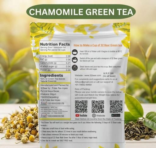 Chamomile Green Tea For Better Sleep and Weight Loss The 32 Baar Magic Chamomile Flavor Green Tea comes with healthy instruction and guaranteed fat loss tips by Savikar Bhardwaj, who has so far helped thousands of people to loose fat with natural eating habits. This green tea is been specially tested and tried by Savikar Bhardwaj and is one of the best quality ever. Take this green tea 1 hour after every meal thrice a day with the fat loose tips guided by Savikar and see the magic in few days. The tips are : 1. Chew the food at least 32 times. 2. Take very small bites of Roti or Bread. 3. Take a time of at least 30 minutes to finish the food. 4. One day in a week eat regular food without salt.