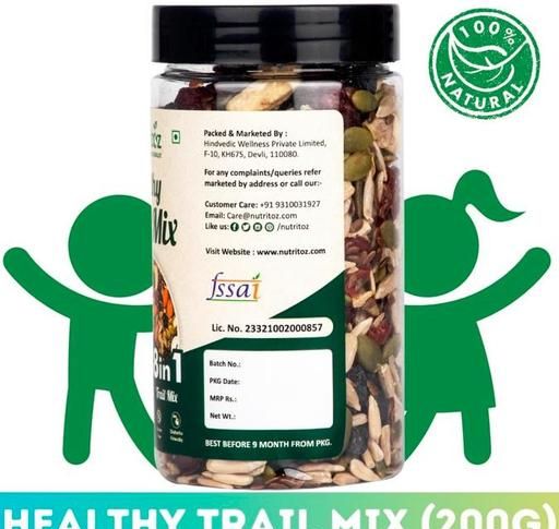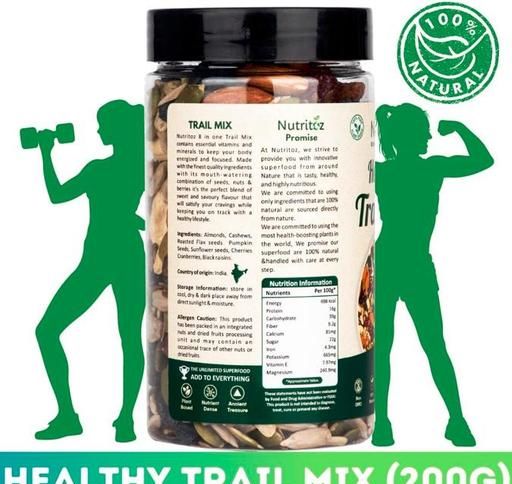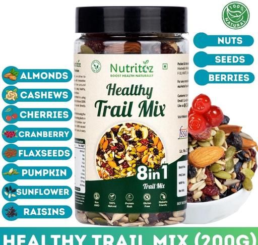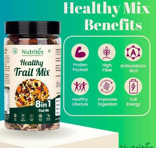Enjoy pure snacking delight with Nutritoz 8 in 1 Trail Mix. Packed with Almonds, Cashews, Sunflower Seeds, Pumpkin Seeds, Flax Seeds, Cherries, Cranberries & Black Raisins, it's a burst of wholesome flavors. Enjoy on-the-go nourishment, from protein-rich nuts to fiber-filled seeds and antioxidant-loaded fruits. Elevate your energy with every bite of our delicious mix.