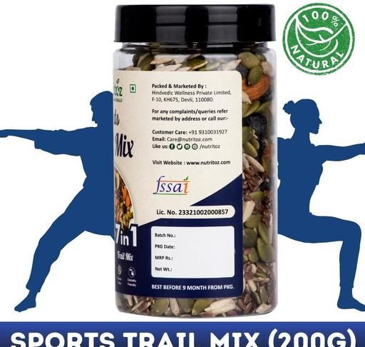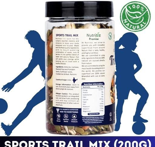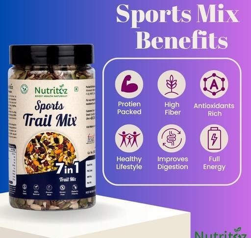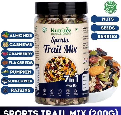 Enjoy pure snacking delight with Nutritoz 7 in 1 Sports Trail Mix. Packed with Almonds, Cashews, Sunflower Seeds, Pumpkin Seeds, Flax Seeds, Cranberries & Black Raisins, it's a burst of wholesome flavors. Enjoy on-the-go nourishment, from protein-rich nuts to fiber-filled seeds and antioxidant-loaded fruits. Elevate your energy with every bite of our delicious mix.