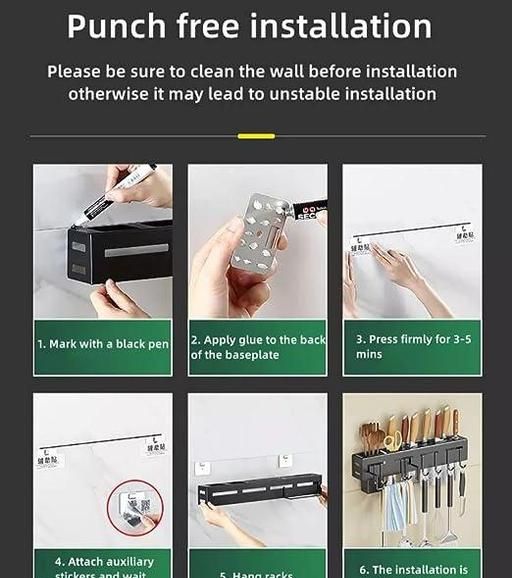 ? ? 2 EASY INSTALLATION METHODS: The pan hanging holder for kitchen offers two mounting options - Self-adhesive & Screw drilling. This kitchen shelf knife rack with towel hanger is easy to wall mount on any smooth and clean surface using: Self-adhesive wall stickers hooks, no drill or screws and hooks