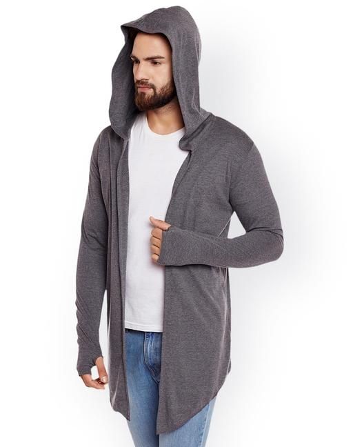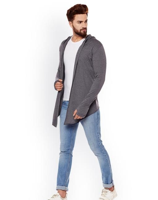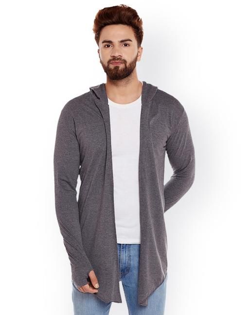 Name: Trendolo Men Dark Grey Hooded Thumbhole Open Long Cardigan Shrug Men's Stylish Solid Cotton Square Neck Collar Full Sleeves Cardigan/Shrug