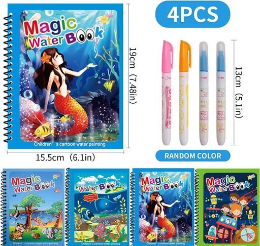 Name: Kid's Magic Water Coloring Books Unlimited Fun with Drawing Reusable Water-Reveal Activity Pad, Chunky-Size Water Pen for Kids - Random Design [4 Books|4 pens]