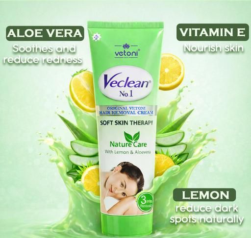 Vetoni Veclean No.1 Hair Removal Cream for Men and Women is your go-to solution for smooth skin from head to toe. This gentle yet effective formula is enriched with the natural goodness of lemon and aloe vera to leave your skin feeling clean fresh and moisturized. It works effortlessly to remove unwanted hair from arms legs underarms chest back and even sensitive areas like genitals. Designed for both men and women it ensures painless hair removal in just a few minutes with no razor cuts or harsh after-effects. Perfect for home use this cream gives you salon-like smoothness without stepping out. The soothing ingredients help reduce irritation to removing hair from the root for longer-lasting results. Whether it's for regular grooming or a quick touch-up before an event this 80 g pack is easy to use and carry. Simply apply wait for the recommended time and wipe away to reveal soft clear skin. Safe for all skin types and best for first-time users as well. Experience confidence comfort and care with every use of Vetoni Veclean Hair Removal Cream.Smooth, Silky Skin: Experience the luxury of smooth, silky skin without the pain and inconvenience of traditional hair removal methods.