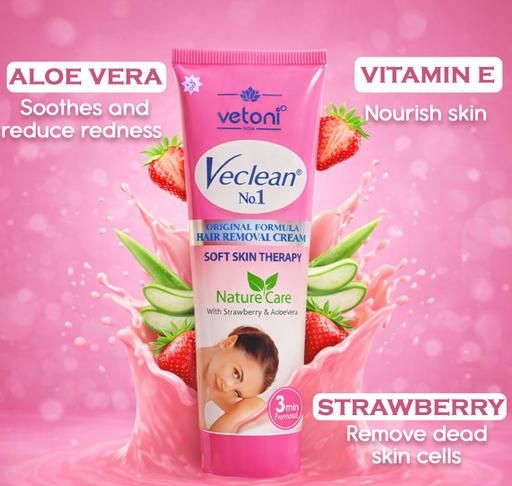 Vetoni Veclean No1 Hair Removal Cream for Men and Women with Strawberry Extract offers an easy painless solution to remove unwanted hair at home. This 80 gram pack contains a gentle formula designed to dissolve hair quickly leaving your skin feeling smooth soft and refreshed. It works effectively on all body parts including sensitive private areas providing safe and comfortable hair removal without irritation or redness. The strawberry extract in the cream nourishes and hydrates the skin during the process preventing dryness and soothing any discomfort. Suitable for both men and women this hair remover is perfect for regular grooming or special occasions when you want flawless hair free skin. Unlike shaving or waxing this cream removes hair from the root giving longer lasting results and eliminating stubble or cuts. Simply apply the cream wait for a few minutes and rinse off to reveal naturally smooth skin that feels soft and silky. The convenient pack of one is best for easy use anytime and anywhere making your hair removal routine simple efficient and painless.