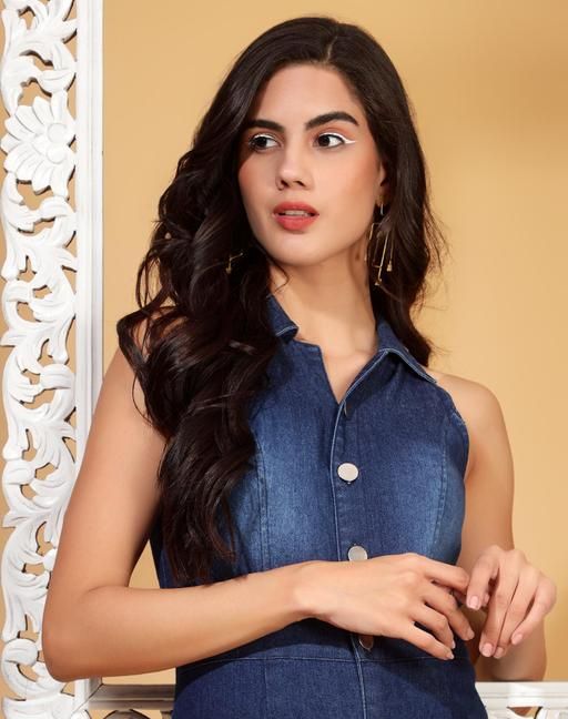 DRAPE AND DAZZLE Presenting Stretchable Denim Bell Bottom Jumpsuit With Buttons At Front relaxed fit jumpsuit with sleeveless. Made from smooth, wrinkle resistant Stretchable Denim fabric, this jumpsuit is sure to look trendy. It is color Black resistant thereby making it long lasting.
