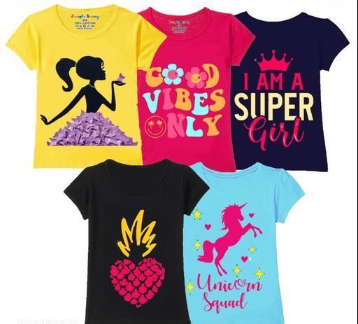 Girl's T-shirt made of Cotton. Pack of 5 t-shirt , Smooth and soft fabric. Perfect fit for girls, High quality and attractive designs. Each of one will love the t-shirt while wearing.