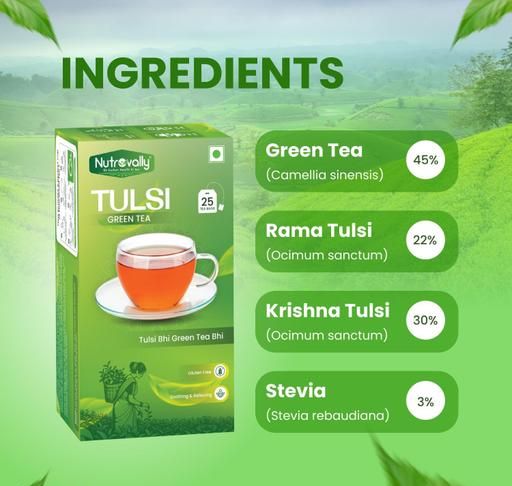 Name: NutroVally-Tulsi Green Tea For Weight Loss Management | High Amount of Rich Anti-Oxidants | Boost Immunity & Metabolism Booster l Premium Quality Tea Bags Tulsi Leaves | Tulsi Green Tea_25+25 Tea Bags