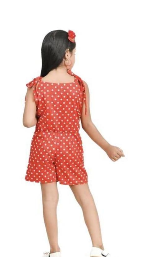 jump suit for girls | red with white polka dots, embroidery, relaxed, one-piece, jumpsuit, adjustable straps, pull-on, sleeveless, square, straight, short, side pockets, Girls, casual, cotton, summer, headband
