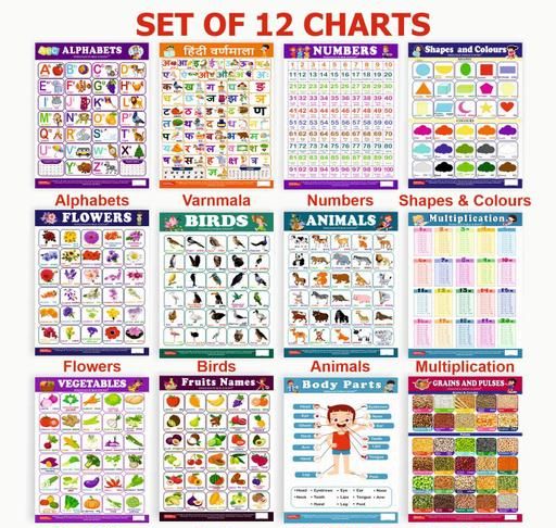 Complete Kids Educational Chart Set of 12 - Preschool Learning Wall Posters ABC, Hindi, Numbers, Multiplication, Shapes, Fruits, Vegetables, Flowers, Colours, Birds, Animals, Body Parts, Grains, Pulses - Explore, Learn, Grow