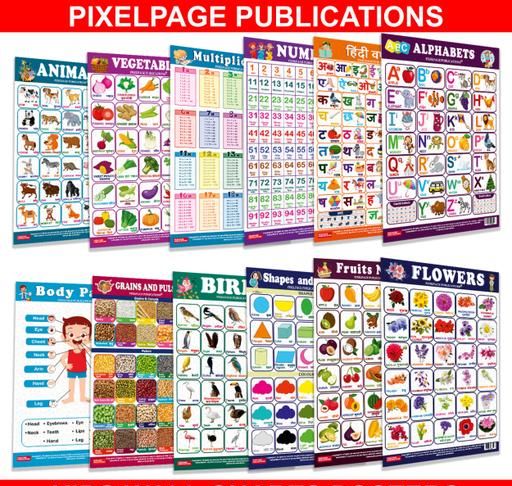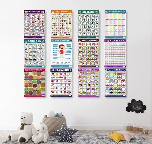 Name: Complete Kids Educational Chart Set of 12 - Preschool Learning Wall Posters ABC, Hindi, Numbers, Multiplication, Shapes, Fruits, Vegetables, Flowers, Colours, Birds, Animals, Body Parts, Grains, Pulses - Explore, Learn, Grow