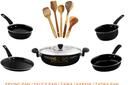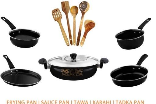 Induction kitchen cookware/Baskeware set, pack of 11 pcs (Kadai, Steel Dhakkan/Lid, Fry pan, Sauce Pan, Tadka Pan, Tawa & 5 wooden Spectula)