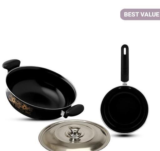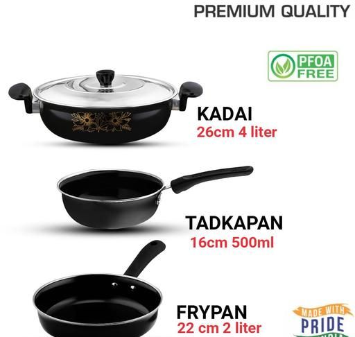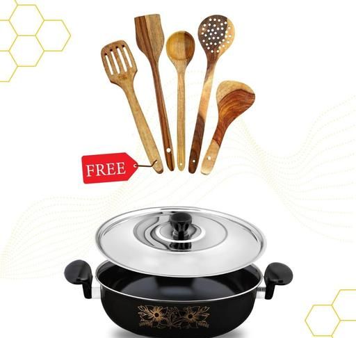 Induction kitchen cookware/Baskeware set, pack of 11 pcs (Kadai, Steel Dhakkan/Lid, Fry pan, Sauce Pan, Tadka Pan, Tawa & 5 wooden Spectula). All Cookware Items are Induction Compatible as well as safe for gas stove. Combo Kitchen Pack.