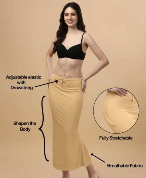 The Saree Shapewear Is Designed With A Targeted Compression To Smoothen Out And Flatter Your Abdomen, Thighs And Back, Making You Look Slimmer. Featuring A Seamless Waistband That Is Strong Enough To To Hold The Saree Tucks. A Side Slit On The Hemline For An Easy Movement. Unlike Other Available Saree Shape Wears, The Slits Are Thoughtfully Designed And Do Not Curve Outwards Giving Any Undesirable Perky Shapes At The Bottom. Crafted With 90% Lycra And 10% Spandex To Retain Its Shape. Can Be Worn Instead Of A Petticoat Or Under The Petticoat. Anti Chafing Thigh Band.