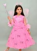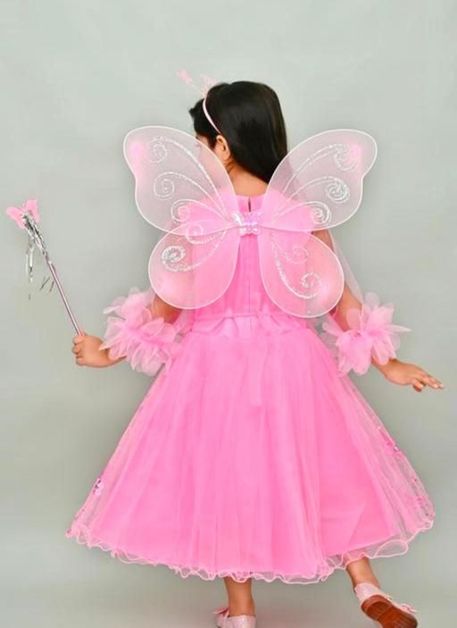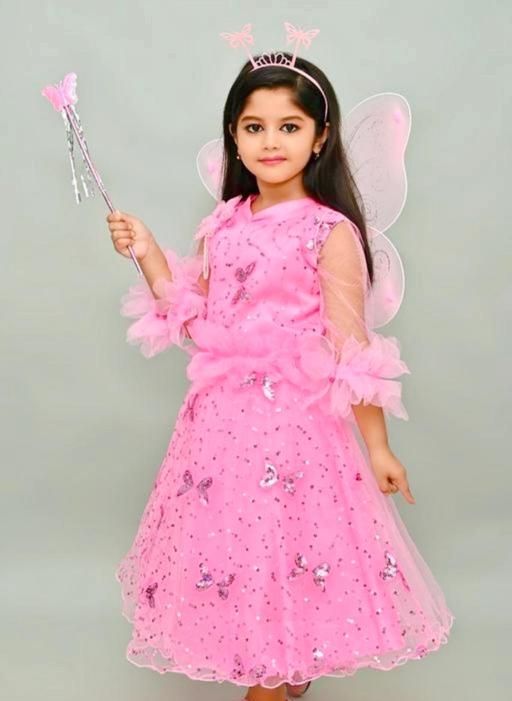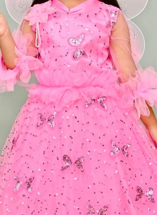 Name: Kids Pori Frock & Dresses | pink with pink sequins and butterfly appliqués, A-line silhouette, tiered skirt, sequins, butterflies, A-line, one-piece, butterfly fairy dress, ruffles, puff sleeve, round, ruffled, maxi, Girls, partywear, tulle, all-season, headband, wings, wand