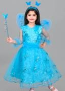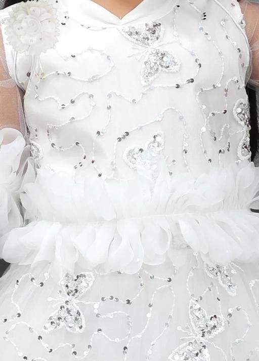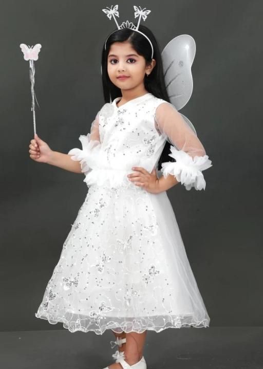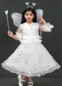 Name: Kids Pori Frock & Dresses | white with silver sequins, butterflies, A-line silhouette, layered skirt, sequins, A-line, dress, fairy dress, ruffles, puff sleeve, V-neck, scalloped, midi, Girls, partywear, tulle, all-season, wings, headband, wand