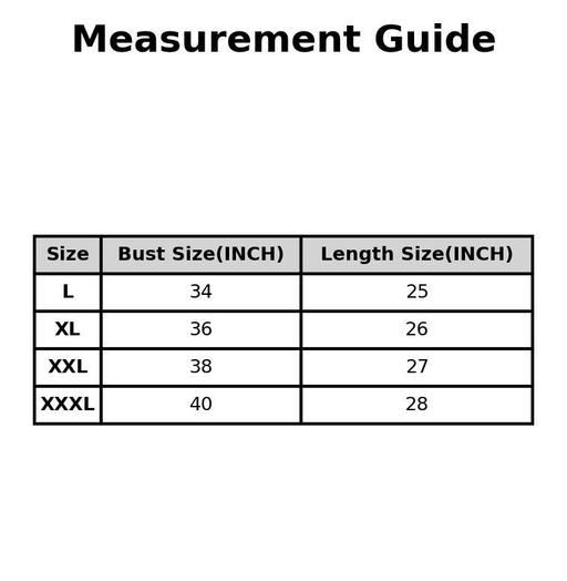 S, M, L (Bust Size: 34 in, Length Size: 25 in)