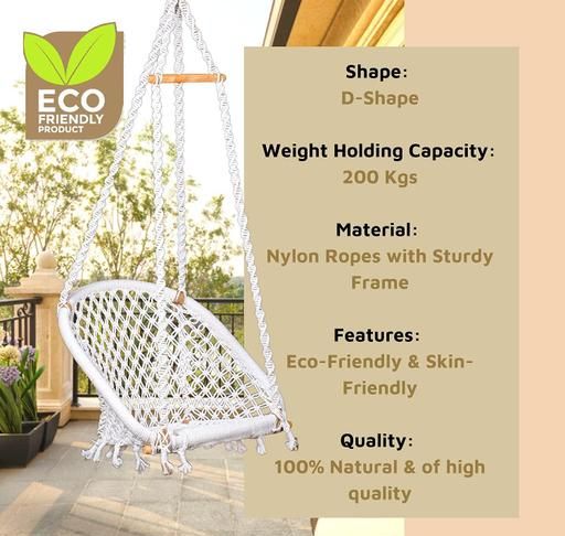 PRODUCT DESCRIPTION: Now larger space, more fun. The premium swing comes in white colour with dimensions 61 x 64 x 152 cm, weight holding capacity of 200 Kgs, Shape - D-Shape, and Material - Cotton ropes with Sturdy PVC frame. Made with 100% natural, eco-friendly, skin-friendly, and high-quality material.