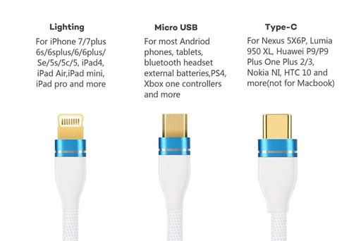Brand New & High Quality. 3 in 1 High Quality Nylon Braided Type-C Micro USB Data Cable Fast Charge Stable Data Transmission Charging Cable for iOS and Android Devices. This data cable features a Type-C port, Lightning port and Micro USB port 3 in 1 design, one cable can charge for your different devices, covenient and pratical. Braided design is more durable. Tinned copper ensures fast and stable performance. Simple appearance, ultra light body is lightweight and portable, easy for you to carry Compatible with i-Phone X, i-Phone 8/8 Plus, i-Phone 7/7 Plus, Sam-sung S8/S8 Plus, Bluetooth headphone, Power bank, Camera, -book Pro, Goo- Pixel, Nexus 6P, and more other USB devices.