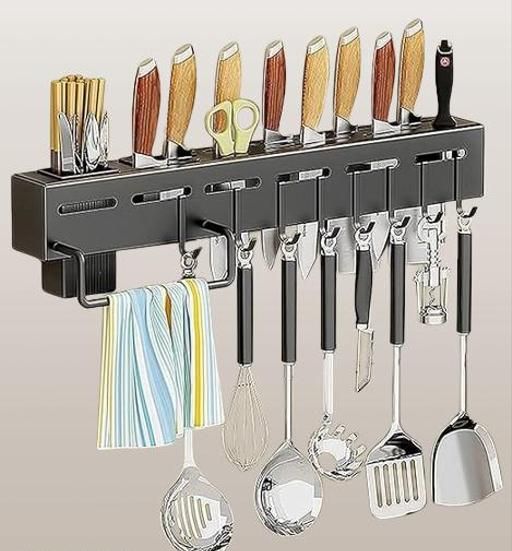 ✔ ✔ MULTIFUNCTIONAL DESIGN: These hangers for kitchen offers ample storage space to hold chopsticks, forks, spoons, towels/napkins, kitchen knives, etc. You can use the hooks on our kitchen hanger to hang pots, pans, and other utensils. It also has a towel bar and 2 slots for holding scissors and everything in one place