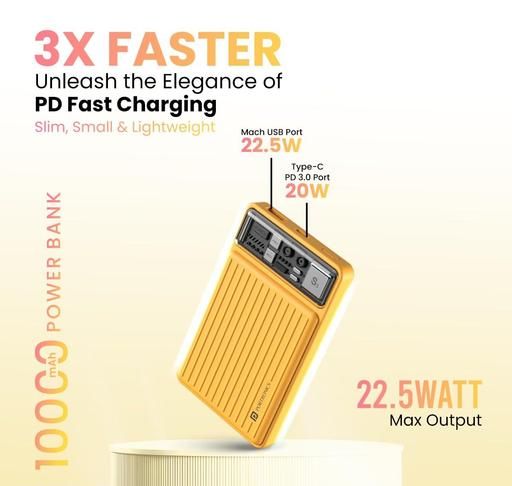 Product Name: Portronics Luxcell Mini 10K Advanced 10000 mAh Smallest Power Bank with 22.5W Max Output, LED Indicator, Mach USB-A Output, Type C PD Output, Type C Input, Wake Up Button(Yellow)