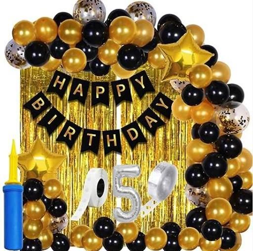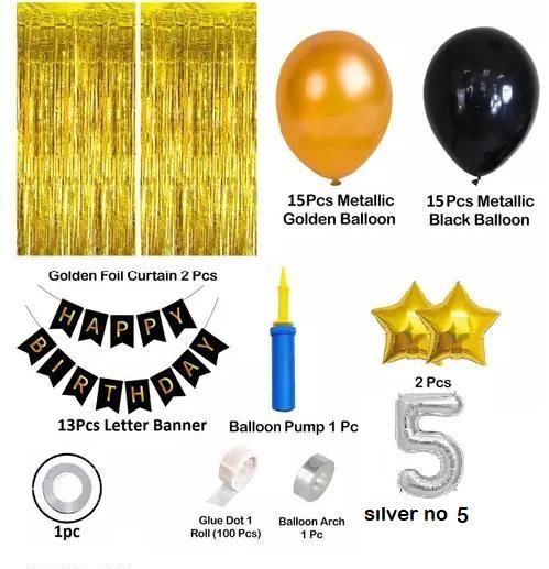 Name: Baby boy 1st to 5th Happy birthday banner 2 pcs golden foil curtian 2 pcs golden star 1 balloon pump 1 ribon silver no 5 foil & gold black 30 pcs balloon arch & dot glue party items