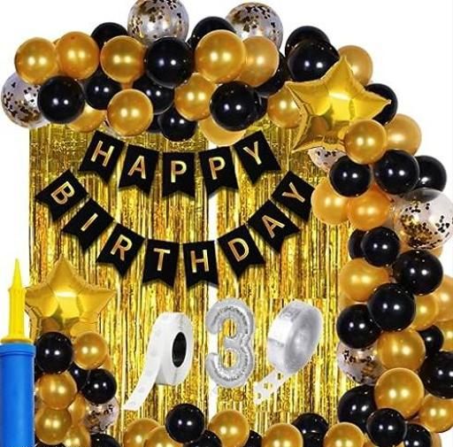 Name: Baby boy 1st to 5th Happy birthday banner 2 pcs golden foil curtian 2 pcs golden star 1 balloon pump 1 ribon silver no 3 foil & gold black 30 pcs balloon arch & dot glue party items