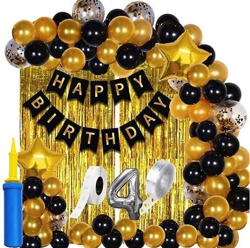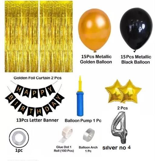 Name: Baby boy 1st to 5th Happy birthday banner 2 pcs golden foil curtian 2 pcs golden star 1 balloon pump 1 ribon silver no 4 foil & gold black 30 pcs balloon arch & dot glue party items