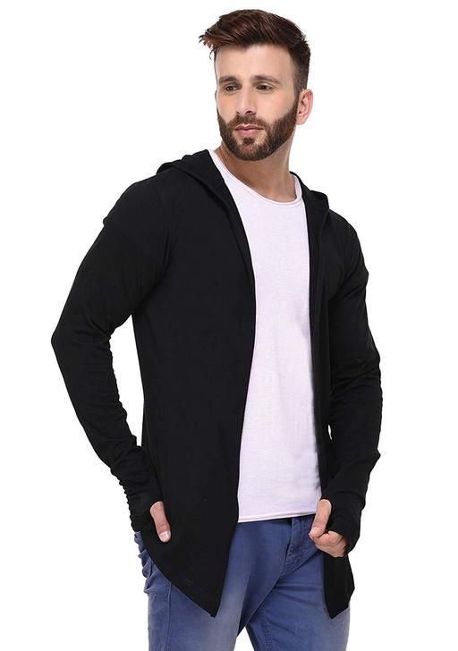 Name: Men Black Hooded Thumbhole Open Long Cardigan Overcoat Shrug Men's Party Wear Solid Cotton Square Neck Collar Full Sleeves Shrug