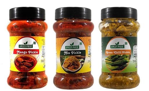 Green Piece Green Chilli Pickle,Mix Pickle and Mango Pickle (250gm X 3) (Pack of 3)