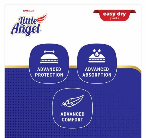 Little angel easy dry pants are made specially for the Indian baby. With first in category features like wetness indicator. Extra thin core designed to give superior absorbency and keep your little angel’s skin dry all day long. It is made with ultra-soft air fresh material and a 360degree soft elastic band to keep your little one’s delicate skin protected from diaper rashes.• ADVANCED PROTECTION – • ADVANCED ABSORPTION – Quick Absorption – • Better Absorption – • ADVACED COMFORT – 360degree Waistband.