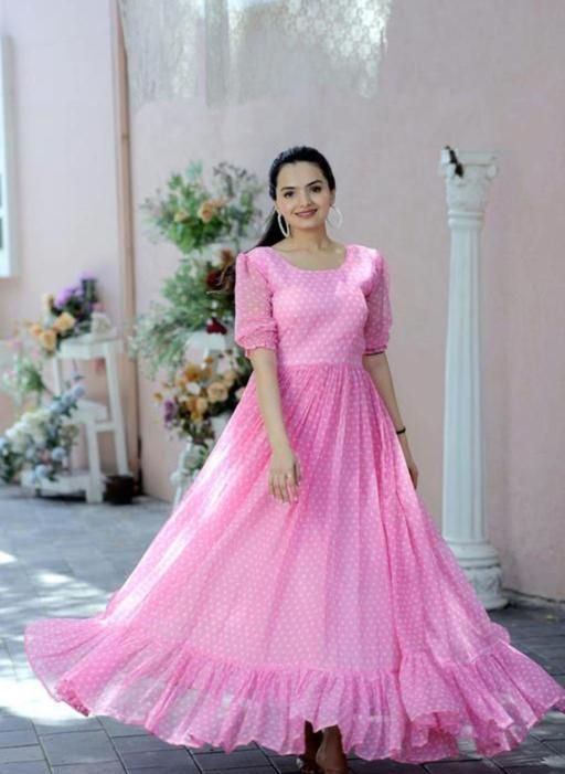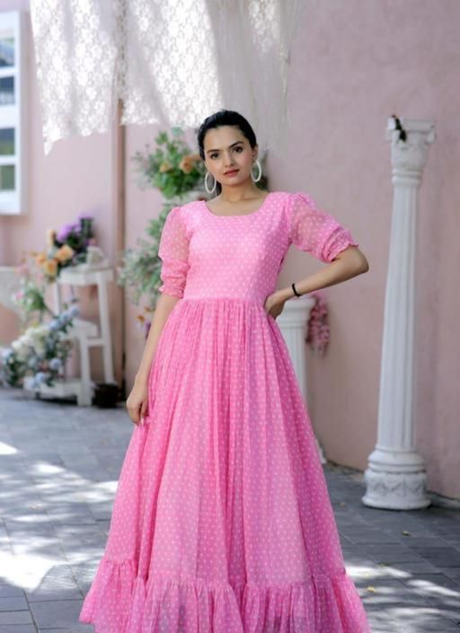 fabric by Georgette round neck stylish sleeve printed long wear casual formal wedding function party wear gown women dress long and girl