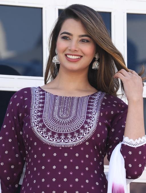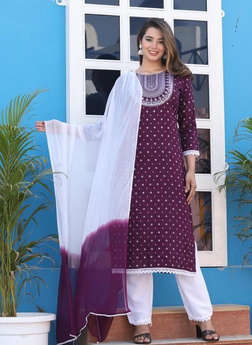 RAYON 3 PC SET FOR WOMAN FASHION WHITE EMROIDERY NECK SUIT PC PRINTED HAND BLOCK