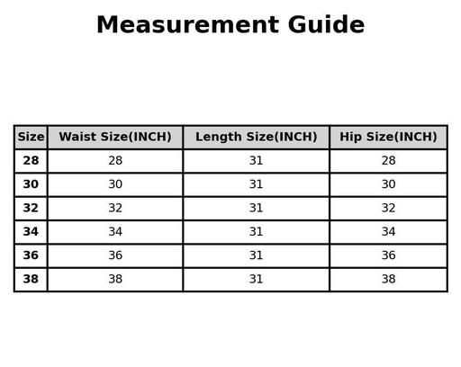 28 (Waist Size: 28 in, Length Size: 31 in, Hip Size: 28 in)