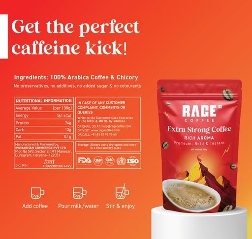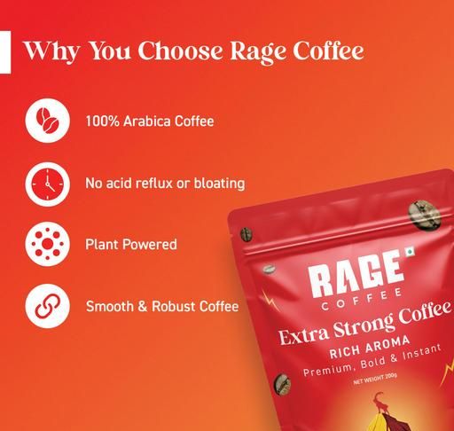 Elevate your day with Rage Coffee's Extra Strong Coffee Powder! Our 100% natural plant-based vitamins blend combines with premium Arabica beans using proprietary small batch crystallisation technology, offering sustained energy, enhanced athletic performance, and heightened cognitive function. Created after months of development and over 85 prototypes, our coffee stacks the best natural vitamins, herbal extracts, and Ethiopian-grown high-quality coffee beans for an intense kick without the hassle of brewing or excessive caffeine. Experience improved brain function with Rage Coffee, promoting healthy brain cell electrical activity. Our scientifically formulated blend synergizes supplements with caffeine, backed by years of clinical studies— all in an all-natural, plant-based package!