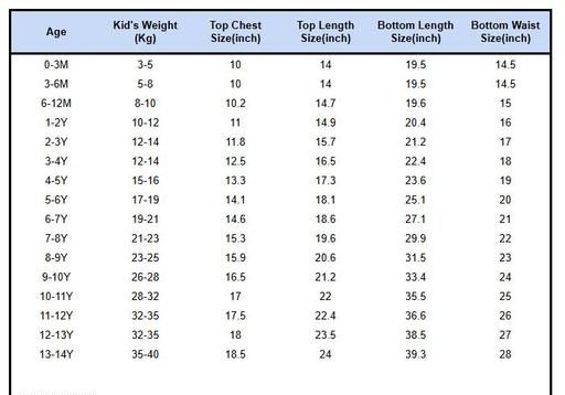 2-3 Years (Top Chest Size: 11 in, Top Length Size: 15 in, Bottom Waist Size: 15 in, Bottom Length Size: 19 in)
