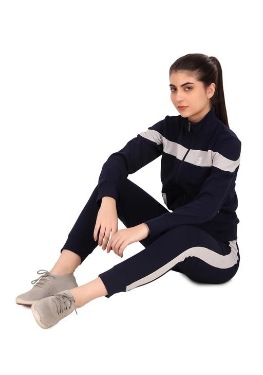 A women's tracksuit is a comfortable, stylish, and versatile outfit typically made from soft, stretchy fabrics like cotton blend. It includes a jacket and matching pants, designed for both athletic activities and casual wear. The jacket often features a zip-up front, adjustable cuffs, and a hood, while the pants are usually tapered or straight-leg with an elastic waistband for a snug yet flexible fit. Available in a wide range of colors, patterns, and designs, a tracksuit can offer a sporty, laid-back look that’s perfect for lounging, running errands, or hitting the gym.