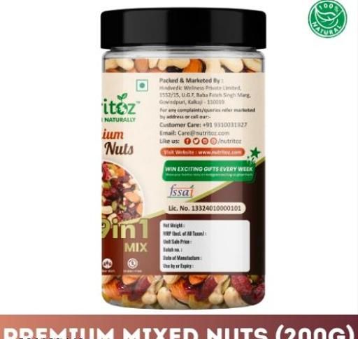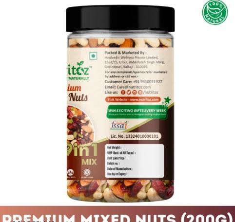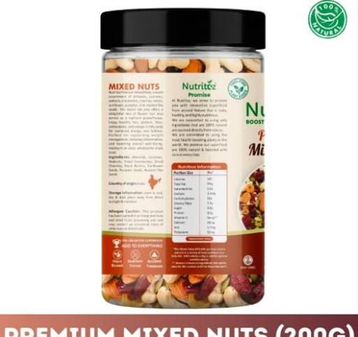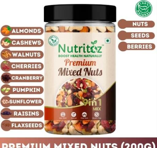 Name: "Premium Mixed Nuts 200G - Almonds, Cashews, Walnuts, Cranberries, Cherries, Raisins, Sunflower, Flaxseeds & Pumpkin seeds. Packed with Protein, Antioxidants, essential vitamins and minerals| Best for Snacking & energy booster 200GM (Pack of 1)"