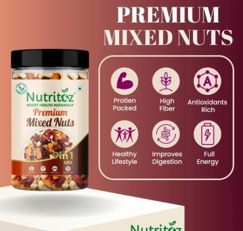 "Nutritoz Premium Mixed Nuts with almonds, cashews, walnuts, cranberries, cherries, raisins,