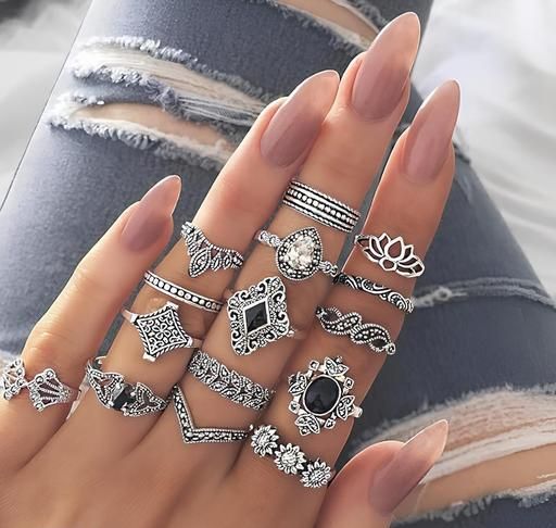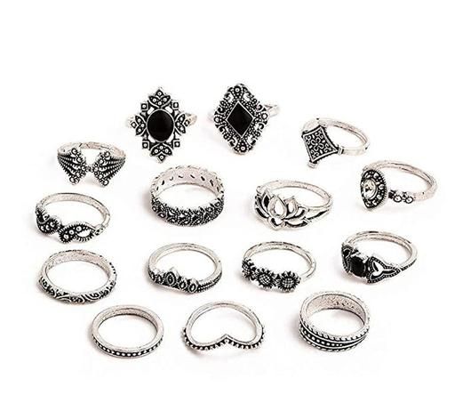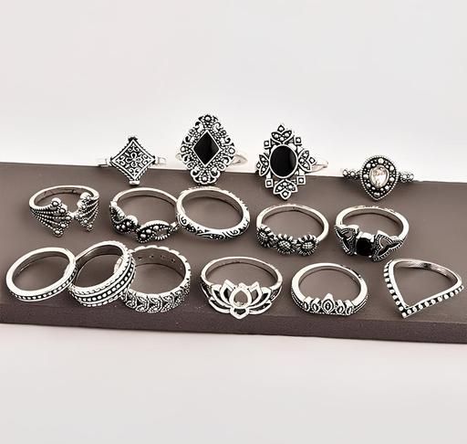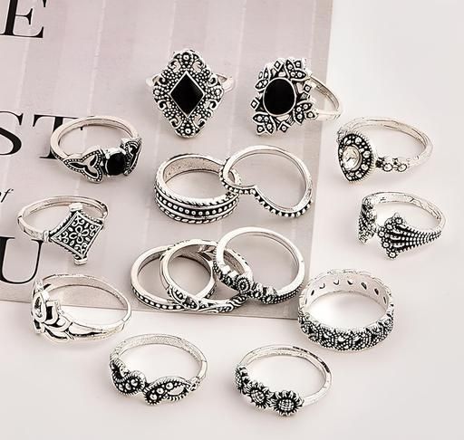 Silver Plated Fifteen Piece Vintage Floral Designs Plushy Ring Set For Women and Girls. Girls fashion jewellery presents these stylish rings suitable for all occasions office wear, wedding and party wear. the color complements all outfits and Girls. may be worn as a traditional/statement piece to any occasion