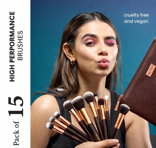 Professional Makeup Brush Applicator Set of 15pcs with Premium Leather Pouch (Brown Colour)