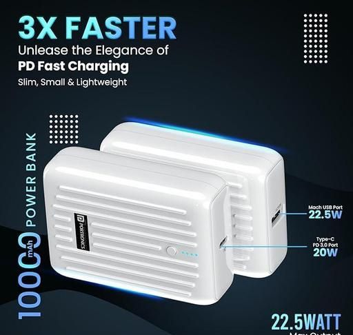 Amidst the hustle and bustle of daily life, the Portronics Zapcell 10K Power Bank emerges as a reliable power bank companion. Weighing just 175 grams, it disappears into your pocket or bag, ready to power up your devices on the go. Its 10,000 mAh battery, delivers an impressive 22.5 watts max. With both Mach USB-A (22.5W) and Type-C PD 3.0 (20W) dual ports, it effortlessly charges two devices simultaneously, use the Type C port to charge the power bank as well. Crafted in India, it has an LED battery indicator and a Wake-Up button that activates the power bank at your command. BIS-certified for top-tier protection, this power bank is your ticket to enduring power, fast-paced living, and peace of mind.